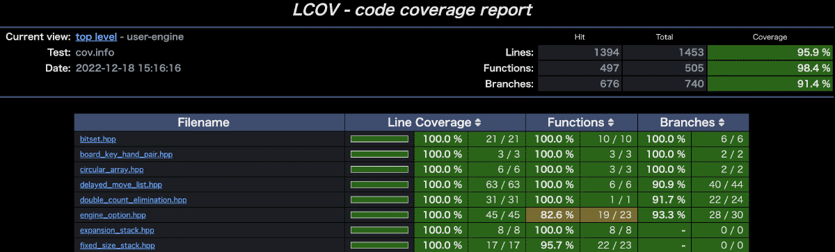 探索部以外のほぼ全てのコンポーネントに対し、単体テストを追加した。単体テストの追加に伴い、クラスの分割粒度やファイル分割粒度についても見直しを行った。現在、Line Coverageが96%程度、Branch Coerageが91%程度のテストが書かれている。